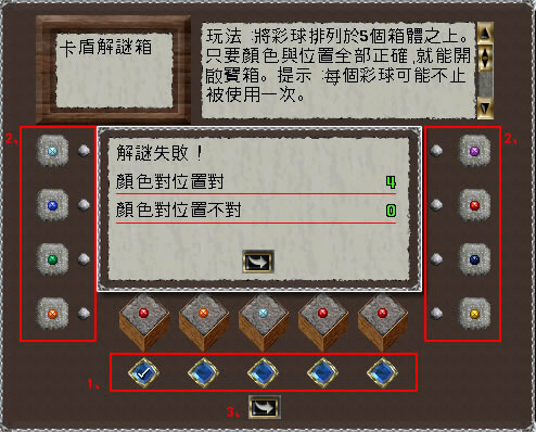 將左右兩邊的8色彩球,排列到中間的5個箱體之上。只要顏色與位置全部正確,就能開啟寶箱。